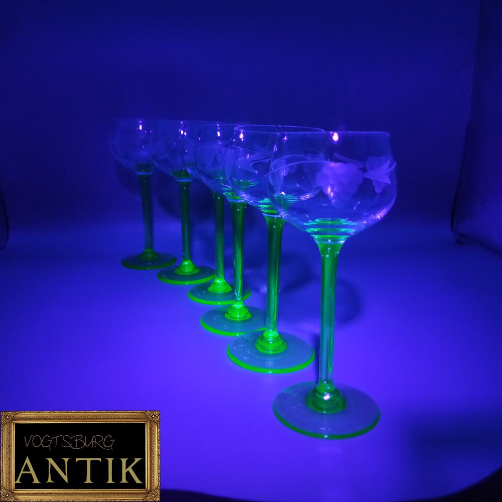 6 Weingläser Römer Jugendstil Uranglas um 1900 , farblose geschliffen Kuppa auf grünem Stiel und Fuß aus Uranglas.