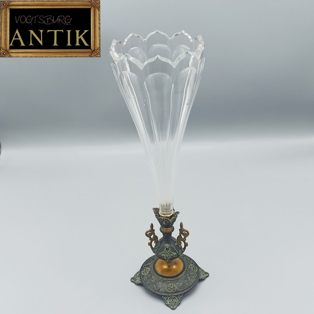 Schön verzierter Fuß aus Bronze / Messing. Metallfuß und der Einsatz aus geschliffenem Kristall haben keinerlei Beschädigungen, im unteren Bereich des Glas ist ein Ring, der leicht blind ist.