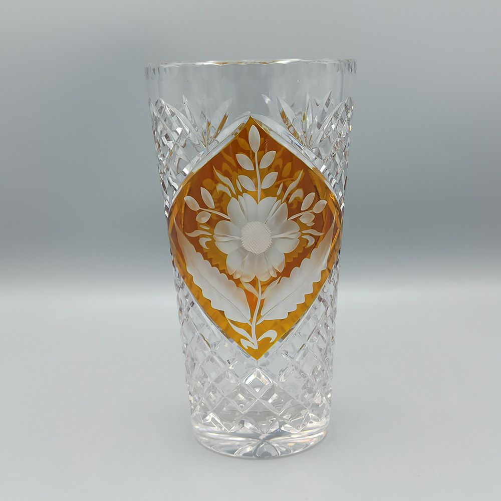 Vase hochwertigem Bleikristallglas, leicht konischer Gefäßkörper, Wandung mit Brikettschliff und quadratischer Reserve in Bernsteinätze mit Blüten- und Blattdekor, polierte Standfläche mit Strahlenschliffdekor, polierter Vasenrand.